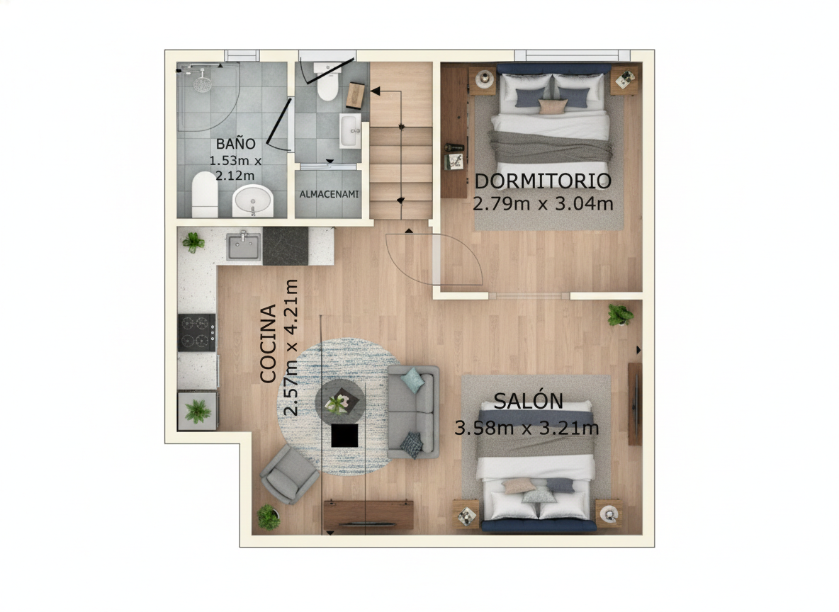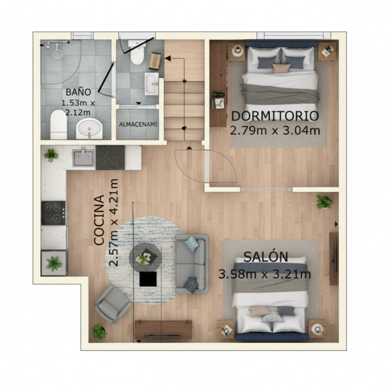55 m² construidos (45 m² útiles) perfectamente aprovechados, distribuidos en: